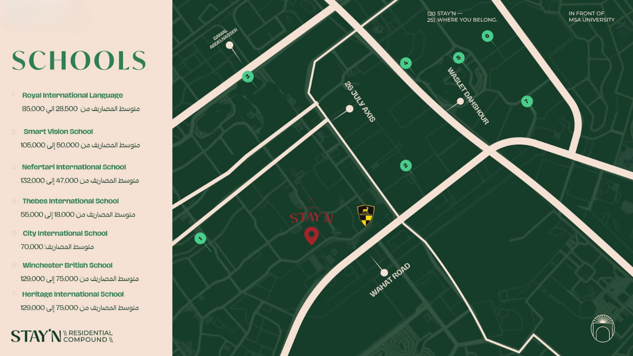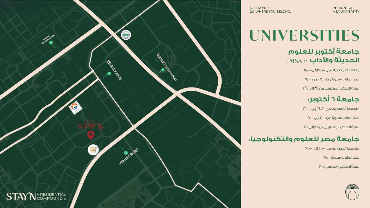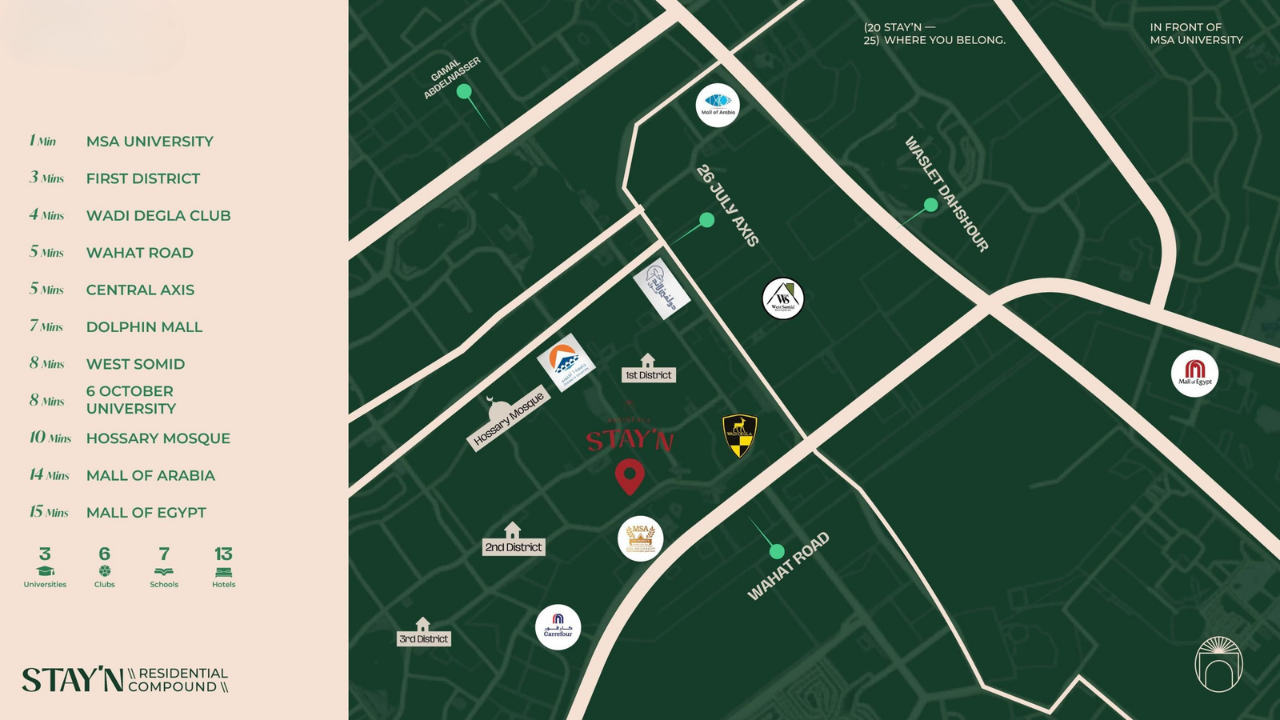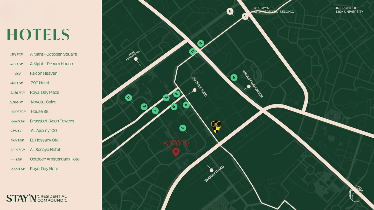 StayIn is a premium residential project offering luxury apartments with full hotel services, strategically located near MSI University and major educational, commercial, and leisure hubs. The project features fully finished studios, one- and two-bedroom apartments designed for students, families, and investors, ensuring high rental demand and consistent income.